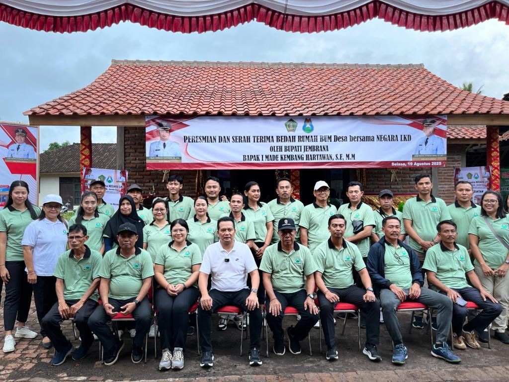 Bupati Jembrana, I Made Kembang Hartawan, menyerahkan bantuan bedah rumah kepada empat keluarga di Kecamatan Negara, Selasa (19/8/25). Program ini terwujud berkat kerja sama antara Badan Usaha Milik Desa Bersama (Bumdes Bersama) dan Lembaga Keuangan Desa (LKD) Kecamatan Negara sebagai upaya menghadirkan rumah layak huni bagi warga.